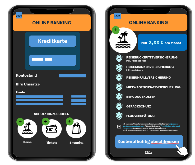 Beispiel für eine Kreditkarte mit eingebautem Reiseschutz . Das könnte ebenso ein Lieferschutz oder ein Ticket-Schutz sein. Einer unser Bankpartner hat sich für einen Reiseschutz plus Assistance entschieden. Hier das Online-Beispiel.